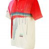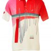 Australian L’Alpina polo shirt featuring an eye catching graphic in striking colour ways of Red, Pink, Burgundy, and Blue set against a crisp white background with the iconic Kangaroo embroidered chest logo in white.