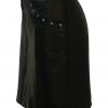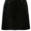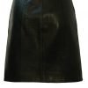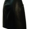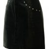 Black leather rock chick mini skirt with great design details that include a series of silver studs at the edges of curved front pockets and along the belt which fastens with interlocking silver loops. The leather has a lovely soft feel to it with a slight texture and additionally features a long zip at the front. It is also fully lined in black.