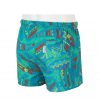 Blue cotton swim shorts with a geometric pattern in vibrant colourways of yellow, jade green and red with purple highlights. The size label states an Italian 48/German 48/French 44 and UK 32 which we have equated to a size S/M due to the elasticated waistband.