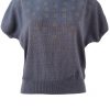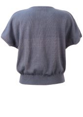 Short sleeved cotton jumper in a lovely blue/grey colour tone highlighted by a pretty metallic gold floral pattern. The jumper has gentle batwing style sleeves which extend down past the chest. For this reason, we cannot provide an accurate chest measurement, however our sizing guideline is an M.