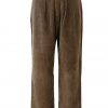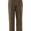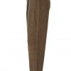 Cord trousers in a mushroom brown colour tone with pleat detail at the front and a relatively wide leg. The cords have asymmetric side seam pockets and a button fastening seam pocket at the back. In excellent condition.
