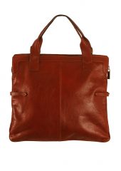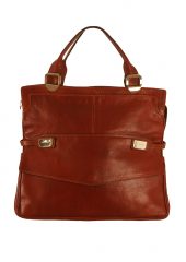 Brown leather zip fastening handbag with subtle tan coloured stitching around the edges and gold trim detail at the straps and central part of the bag which features a front flap pocket that closes with a concealed press stud. The inside of the bag is lined and has two inner pockets, one of which fastens with a zip.