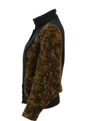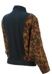 Striking cropped jacket with a navy blue front and back panel from which extend batwing sleeves in lovely colourways of ochre, burgundy, woodland green and blue. Although there is no fabric label, the jacket has a woollen feel to it.
