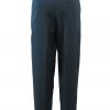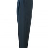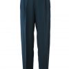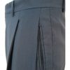 Dark blue pleat front tailored trousers with a fine check pattern in a subtle lighter blue. The trousers have asymmetric side pockets as well as a small seam pocket beneath the waistband and a back pocket. They are made from lightweight pure new wool and are in excellent condition.