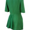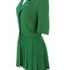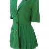 Green short sleeved jacket with lovely pleat detailing that wraps around the left hand side of the garment. The jacket has a dual texture to it with the body made from a mid weight linen type fabric and the pleated part made from a T-shirt type fabric which creates loose style pleating. The jacket cinches in slightly at the waist with the additional feature of a front pocket.