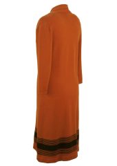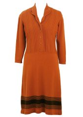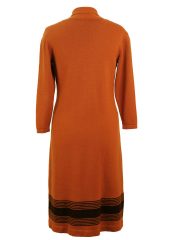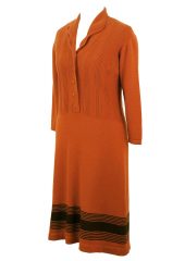 Mid length knitted dress in a warm russet tone with contrasting brown striped trim around the hem. Design detail extends to a lovely cardigan style top with wide rib knit detail and pretty collar feature.