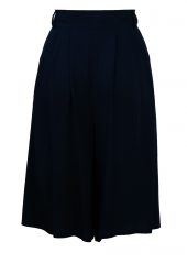 Navy blue, knee length culottes with gentle pleat detailing and side seam pockets. The culottes fasten at the front – left of centre, concealing the cut of the trousers and giving the illusion of a skirt from the front.
