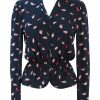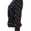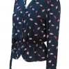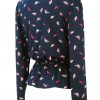 Long sleeve navy blue top with a cinched in, elasticated waist that creates a lovely peplum shape. The fabric has a subtle sheen to it with a very fine ribbed texture and features a pretty pink & white feather-like pattern. It also has the added benefit of being able to be worn as a lightweight jacket!
