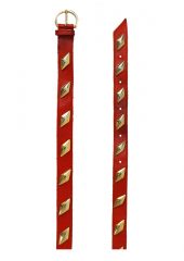 Rich red leather belt with a striking design of gold metal diamond shapes emblazoned along the length of the belt. There is some minor wear in line with age and two additional holes have been made at the end of the belt. We have reduced the price to allow for this – the belt is overall in great condition!