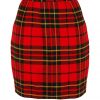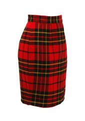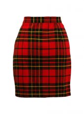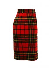 Soft and cosy wool blend mini skirt in vivid tones of red, yellow and black tartan. Form fitted and fastens at the waist with a side button and zip.