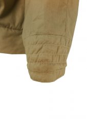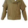 Lightly padded, taupe jacket with some great design touches that include eye catching layered sleeve detail, bold stitched piping and an asymmetric zip fastening concealed beneath the fabric. The jacket is fully lined and although there is no fabric label, it has a cotton feel to it.