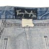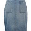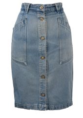 Thierry Mugler denim pencil skirt in a light blue denim. The fabric has a deliberate subtle worn look to it and features some lovely design details that include large angular front pockets, triangular shaped belt loops and silver star bevelled buttons.