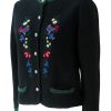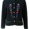 Tyrolean pure wool black cardigan with a lovely tapestry pattern that features birds sitting at the top of an array of flowers in colourways of red, blue and white. The cardigan additionally features green knit trim detail at the neckline, cuffs and front seam pockets as well as traditional Tyrolean silver decorative buttons – and there’s a spare one too!
