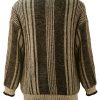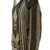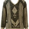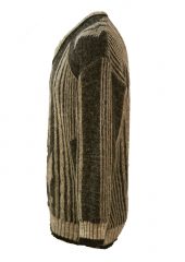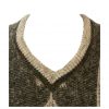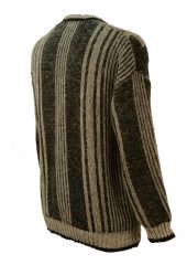 V Neck mottled charcoal grey wool jumper with a stripe detail pattern in a contrasting lighter tone of grey. The jumper also features a subtle multicoloured wool trim at the edge of the V Neck, cuffs and waistband. Although there is no fabric label, the jumper is almost certainly made from wool or predominantly wool.
