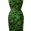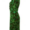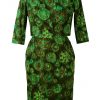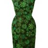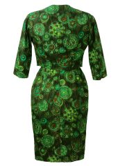 Stunning vintage 1950’s two piece featuring a fitted knee length sleeveless dress and cropped jacket with 3/4 length sleeves and large textured olive green buttons. The two piece has an abstract floral print pattern in striking colourways of mint green, turquoise, brown & white set against an olive green background.