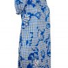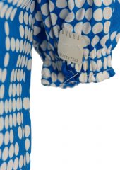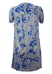 Vintage 1960’s smock style mini dress with a white polka dot and floral pattern that pops against the vibrant royal blue background. The dress is deadstock ie: never worn and with clothing tags still attached.