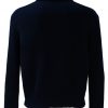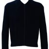 Vintage 1960’s virgin wool, navy zip front cardigan. The garment has a classic 60’s collar and ribbed knit detail at the sleeves, sides and hemline. Slightly raised vertical stripes also feature at the front of the cardigan.