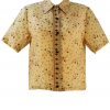 Vintage 1960’s hand made short sleeved blouse with a delicate leaf print in warm tones of russet and brown, offset by a soft beige background. The blouse is semi sheer and because it is hand made doesn’t have a fabric label – though it could be a lightweight viscose.