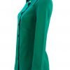 Vintage 1960’s jersey jacket in an eye catching turquoise green colour tone featuring black side buttons each containing a swirl-like pattern in vibrant turquoise. The jacket has a lovely shape to it, cinching in slightly at the waist and flaring out gently beneath with panel detail at the front and cuffs.