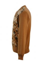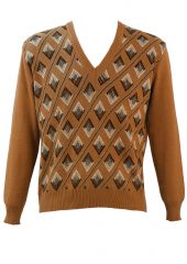 Vintage 1970’s camel coloured v-neck jumper with a diamond shaped pattern in colourways of dark brown and white. We have sized the jumper as a size M for a relatively casual fit and as a possible L for a more fitted cut. Please refer to our measurements for further sizing guidance.