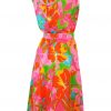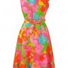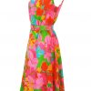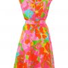 Late 60’s / early 70’s sleeveless dress that sits below the knee with a stuning floral pattern in bright colourways of pink, blue, green, yellow and orange. The dress is fully lined in pale pink and has a semi sheer overlay of the patterned fabric with a matching belt. There is no fabric label, however the dress is probably man made and has a lightweight feel to it – in excellent condition!