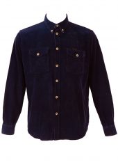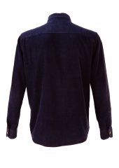 Wrangler blue shirt in a fine corduroy fabric. The shirt has western style pocket detail and a partially lined neckline and cuffs in a bright check pattern of red, green, yellow and blue.